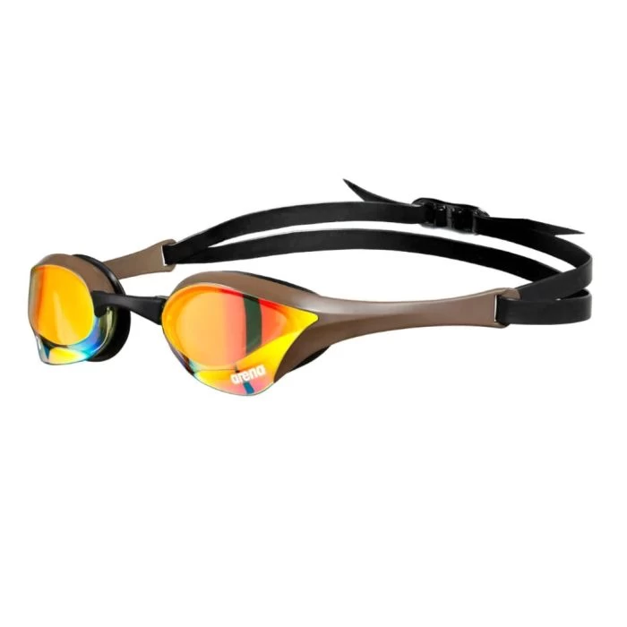 The Arena Cobra Ultra Swipe Mirror Goggles Copper/Choco are Arena’s fastest racing goggles. With a low profile and a sleek hydrodynamic shape that cuts through the water, you can compete at your best. They have a copper mirrored lens, which protects your eyes from bright conditions, but also doesn’t dim your eyesight as much as silver mirrors.