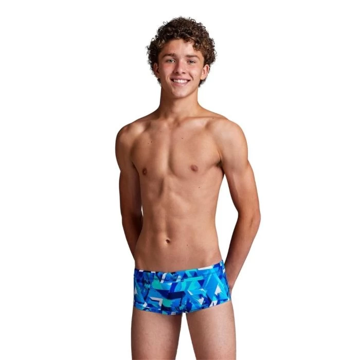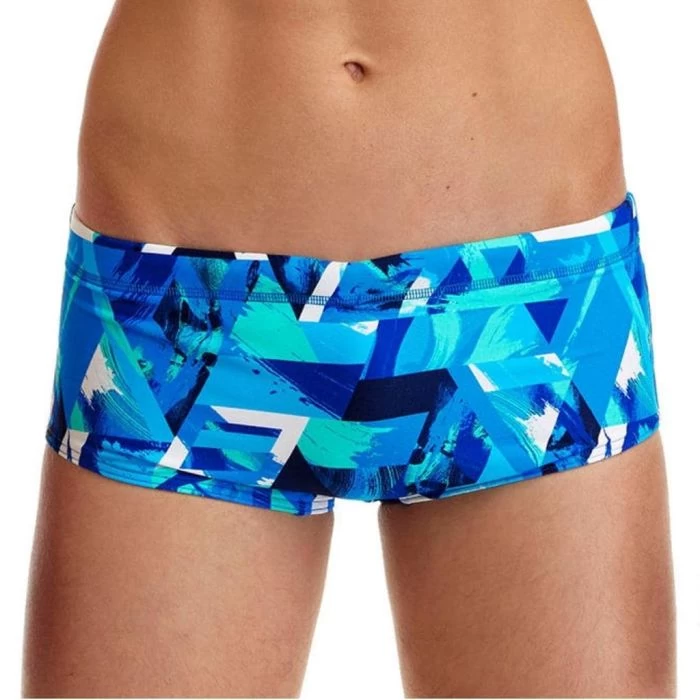 The Funky Trunks Bashed Blue Boy’s Sidewinder Trunks are a short trunk style made for competitive swimmers. They are perfect for training because they are comfortable, durable and chlorine resistant. This pair comes with a fresh blue and white design called Bashed Blue, complete with the rubber Funky Trunks logo.