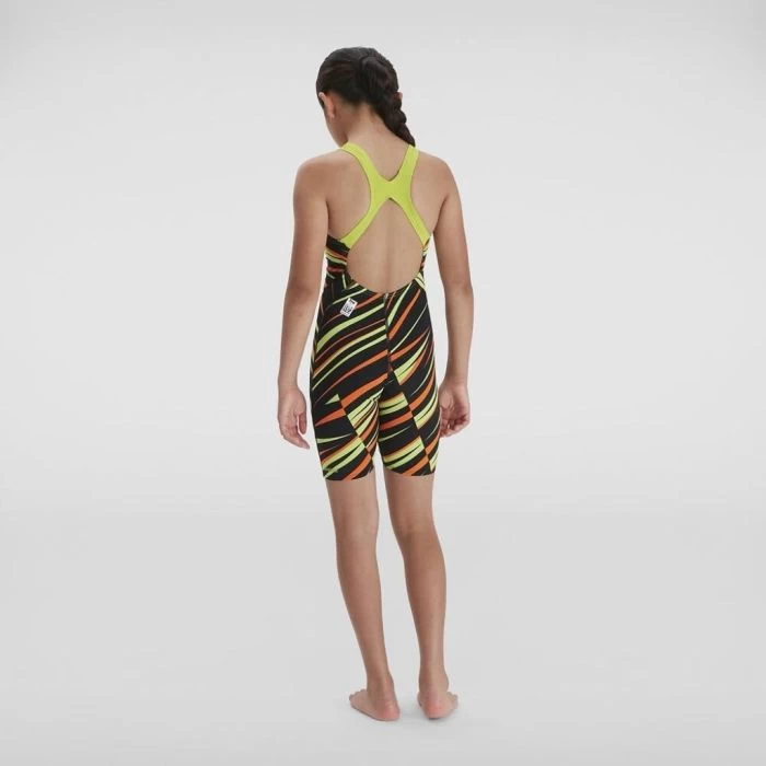 The Speedo Junior Fastskin Endurance+ Kneeskin in Black/Lime/Salso is a race suit for young swimmers. It is FINA-approved and has 4-way stretch fabric with an open back style. Making it extremely comfortable and giving your young swimmer freedom of movement. This swimsuit has a bold all-over chevron print and the Speedo logo on the front.