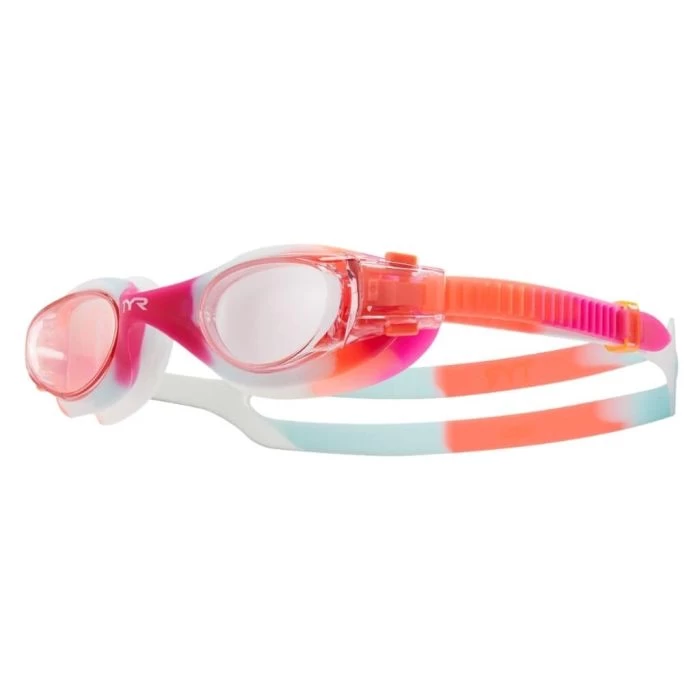 The TYR Vesi Youth Goggle has been constructed with a lightweight low profile and unibody design. It provides a close fit and minimal drag in the water. They have been specifically engineered to fit smaller facial contours of young athletes. This pair comes Tie Dye printed design in Pink & White with clear lens.
